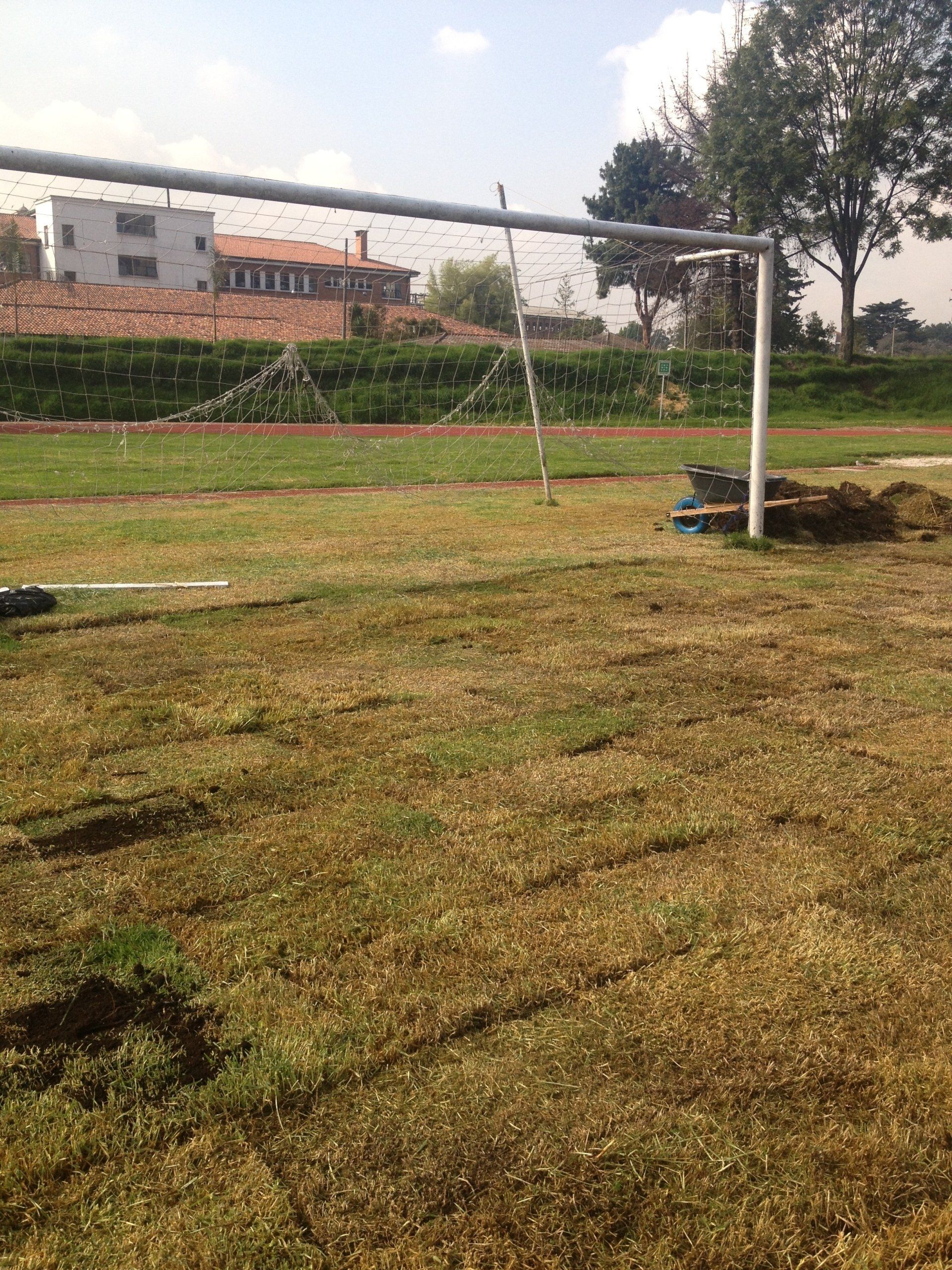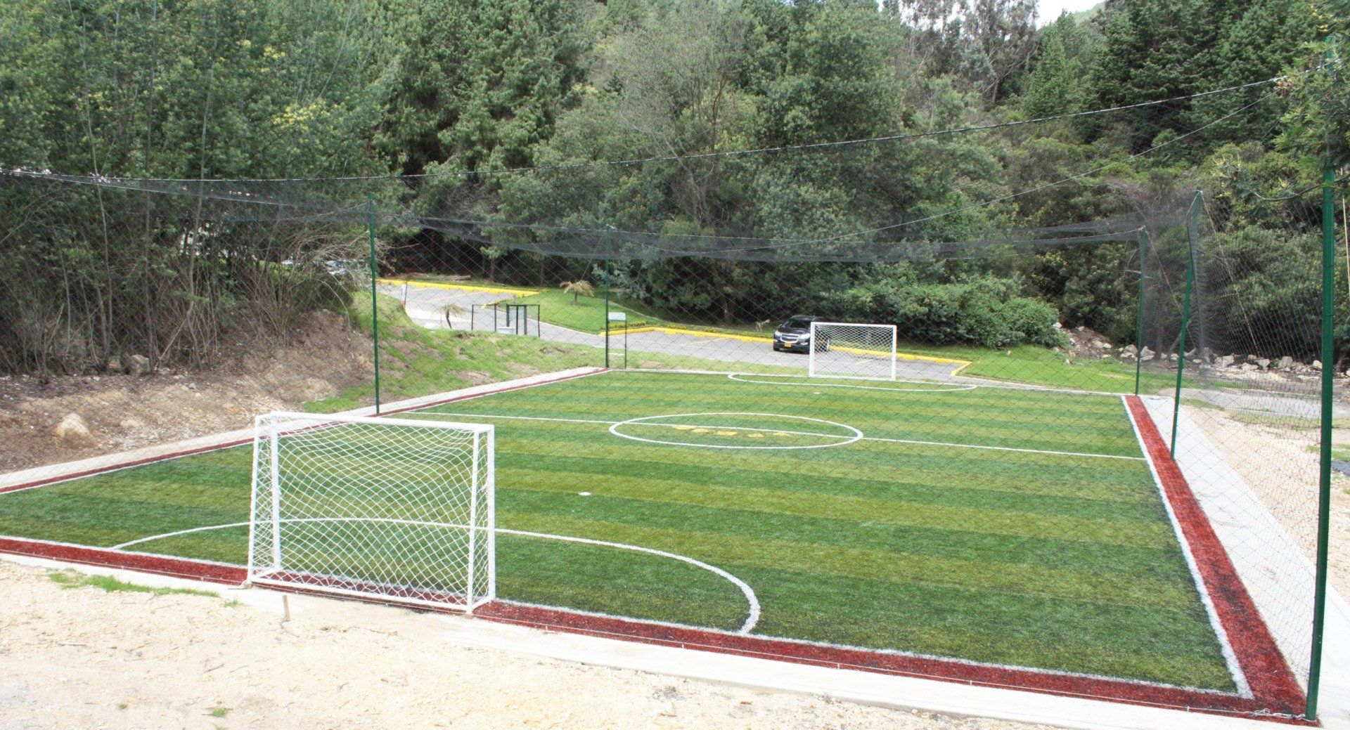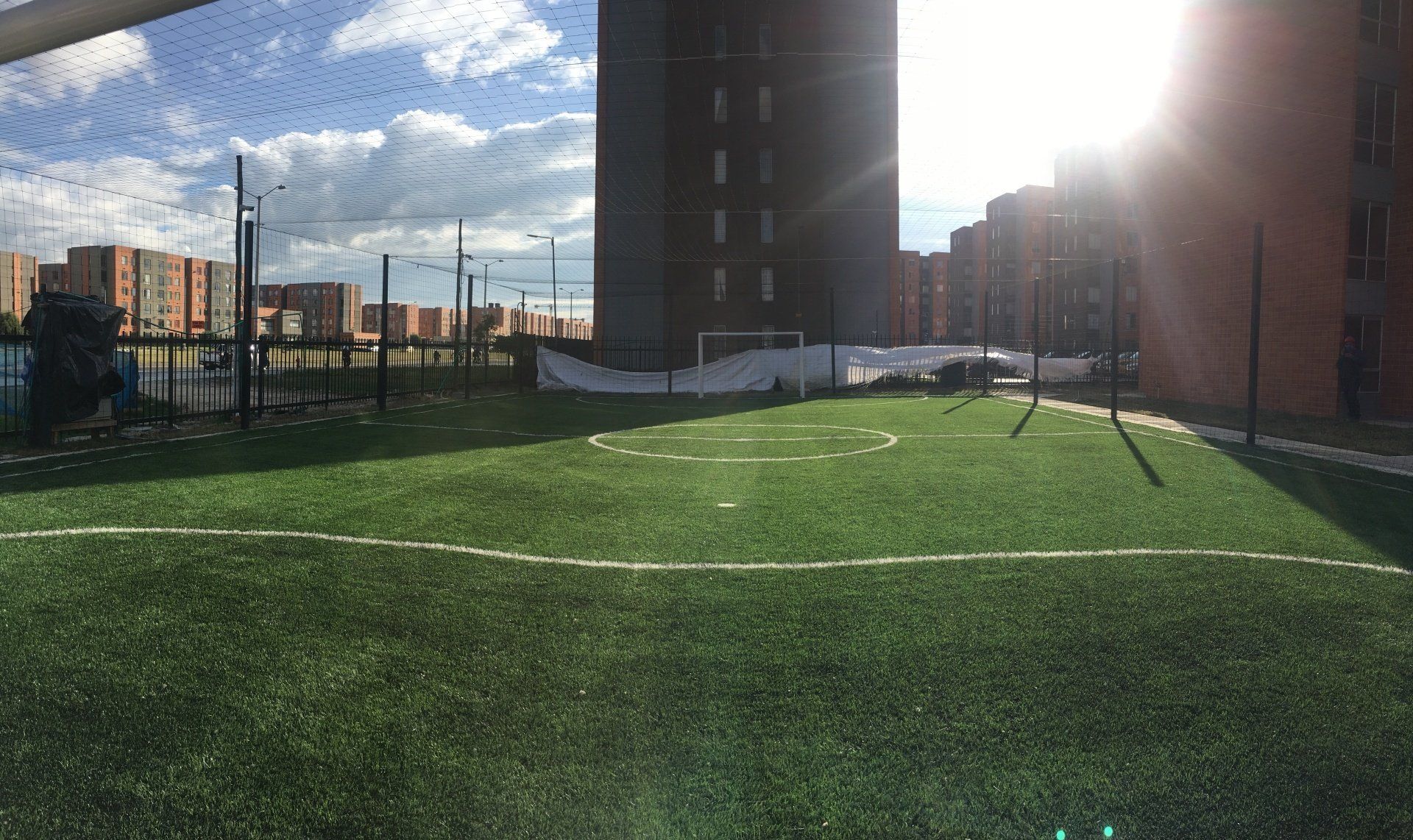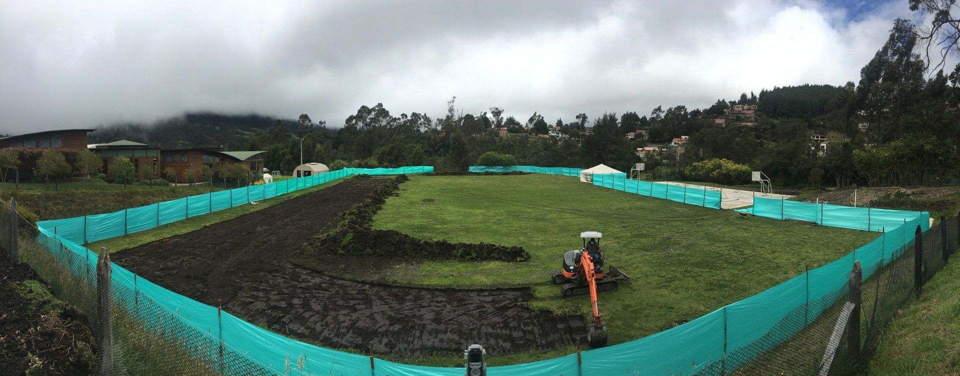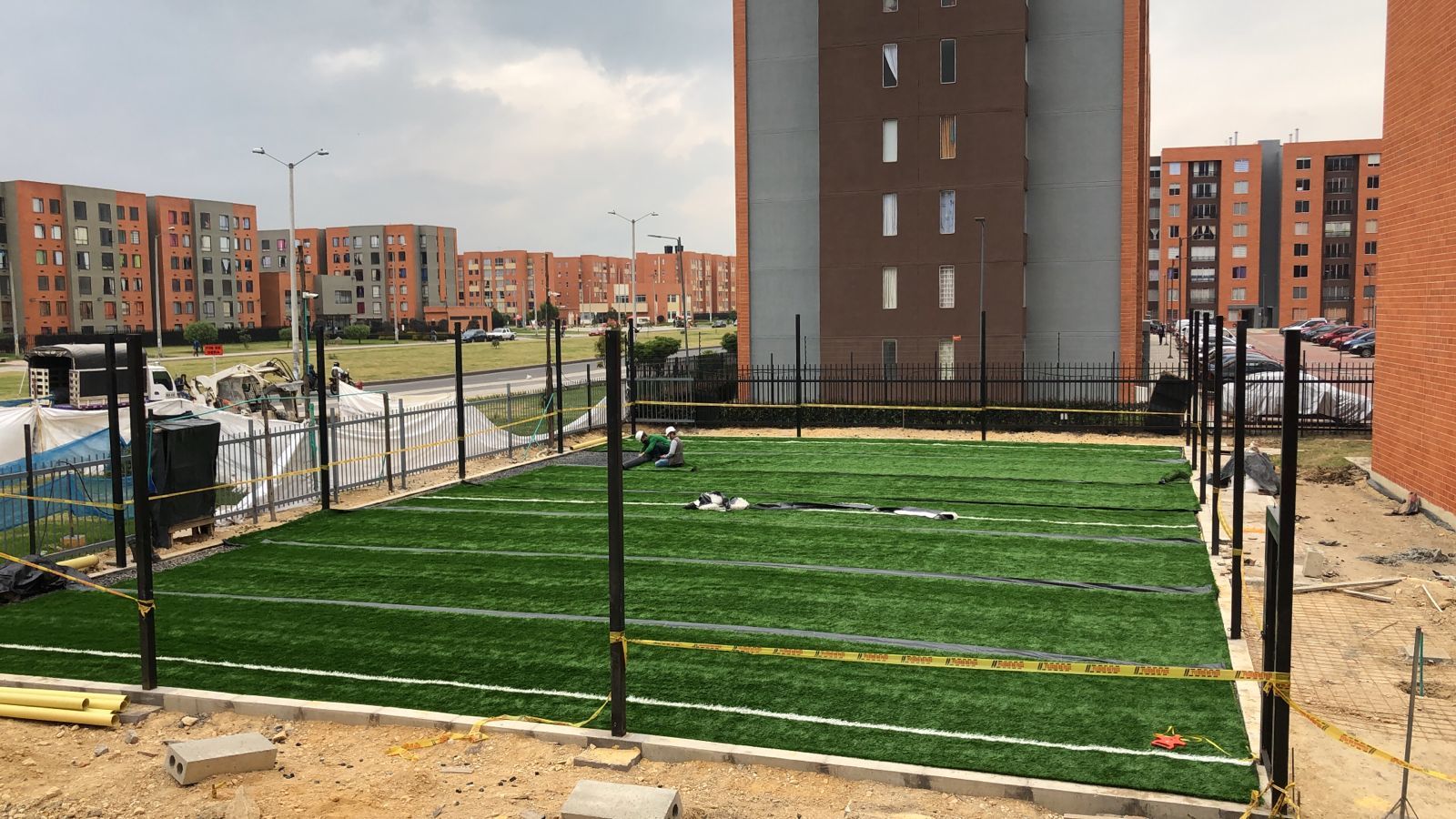 Preparación de superficie (Nivelación y drenajes)-Suministro e instalación de césped sintético-Cerramiento en malla de nylon.