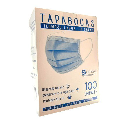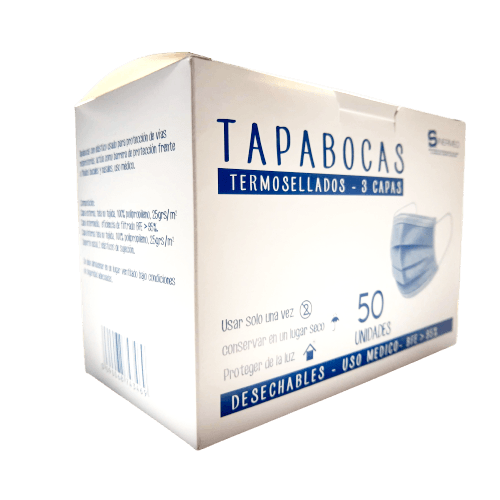 Tapabocas de 3 capas, con 3 pliegues, termo sellado, bandas elásticas para sujeción, con clip ajuste nasal de tirilla de alambre plastificado.